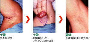 ワキの中央部1ヵ所約3~4cmの切開から皮膚を翻転して直視下にアポクリン汗腺を除去します。