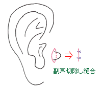 耳介の前方に先天的に(生まれつき)小突起をみとめるものです。中に軟骨を含んでいる場合もあります。 通常は、突出部を切除(きりとる)手術を行います。乳児期であれば、基部を結紮(しばる)だけで脱落させることができる場合があります。大きさや形等、個人差がありますので、ご相談下さい。