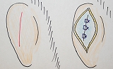 耳介後面を切開して耳介軟骨の後面を剥離します。耳介軟骨に数カ所縫合糸をかけて軟骨を矯正して対耳輪の突出形態を形成します。
